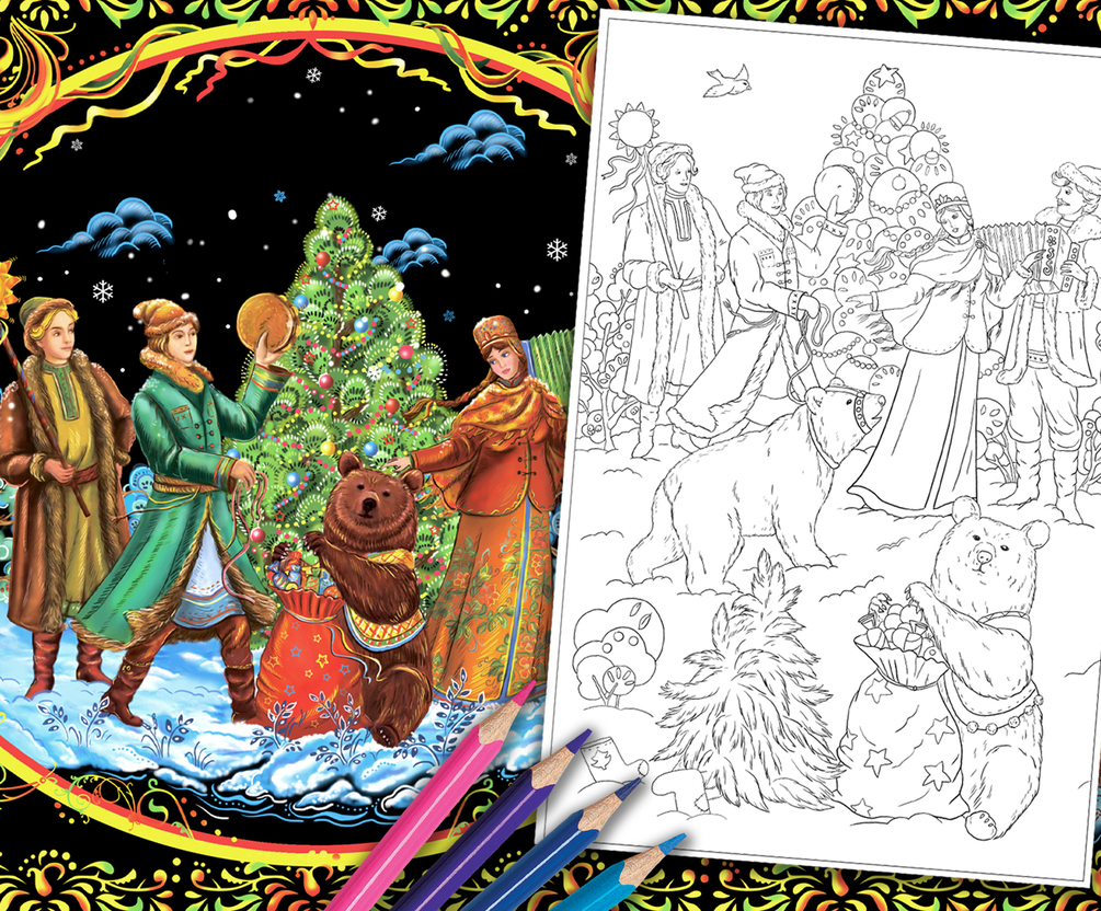This set includes 2 digital line coloring pages by Alena Lazareva . Winter folk festivals. Illustration in the style of Palekh.