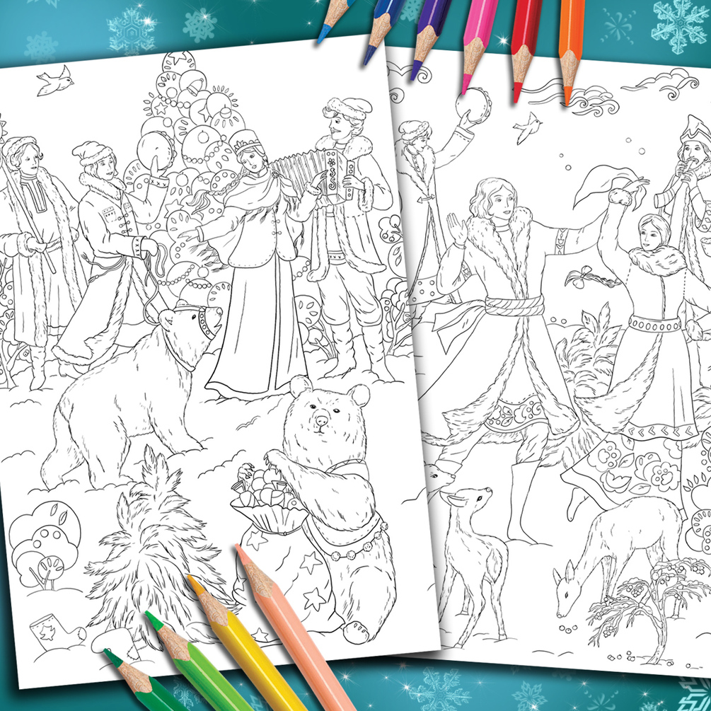 This set includes 2 digital line coloring pages by Alena Lazareva . Winter folk festivals. Illustration in the style of Palekh.