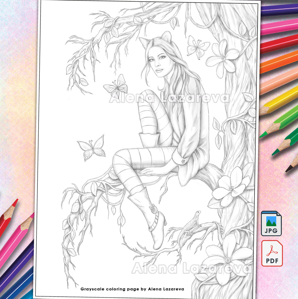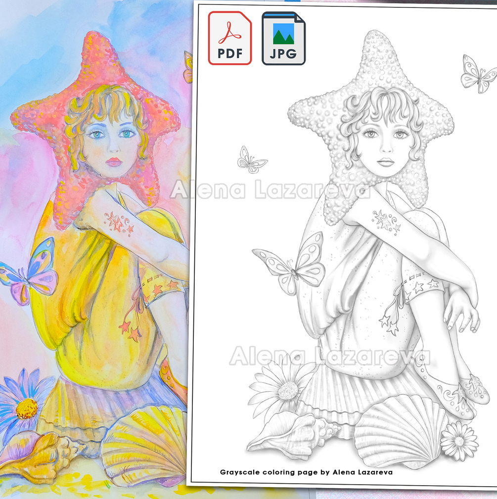 This set includes 3 Grayscale coloring pages by Alena Lazareva: Girl Starfish, Lady Amanita, Lady Cat.