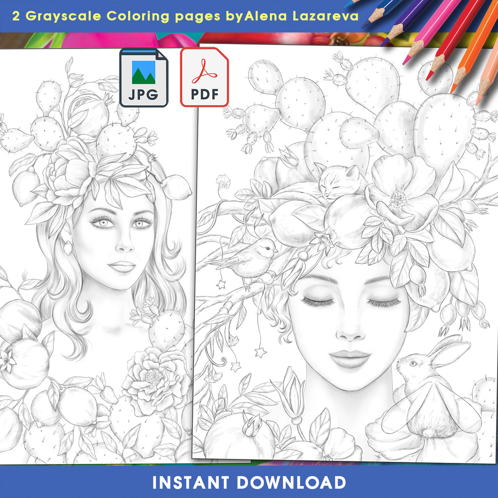 This set includes 2 Grayscale coloring pages by Alena Lazareva .